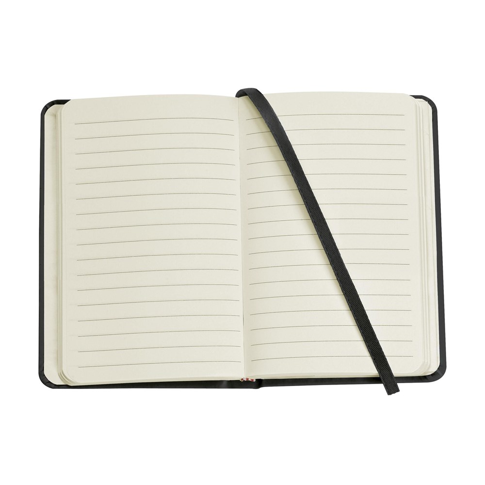 Kompaktes Notizbuch im A6-Format mit ca. 96 Blatt/192 Seiten crèmefarbenem, liniertem FSC Mix zertifiziertes Papier (80 g/m²). Mit gebundenem Rücken und hartem Umschlag, Aufbewahrfach, elastischem Band und seidener Leselitze.