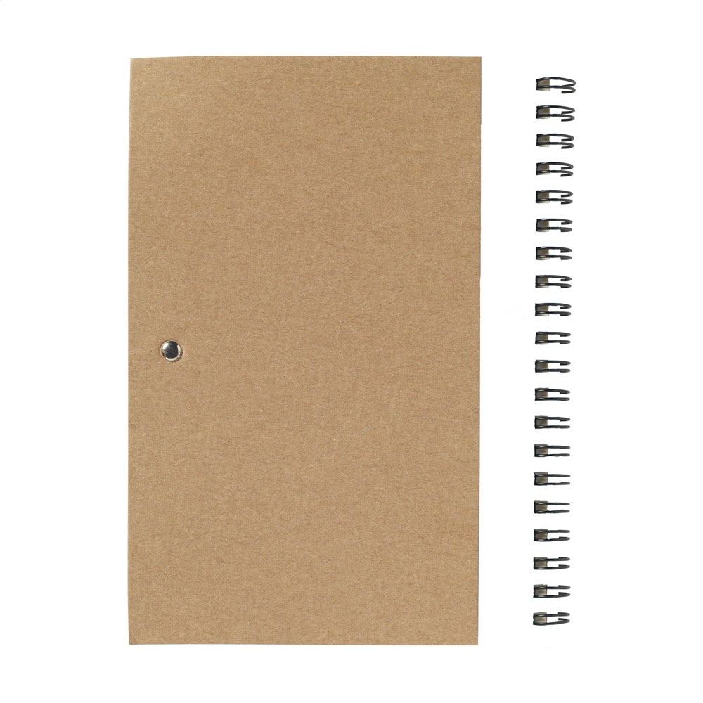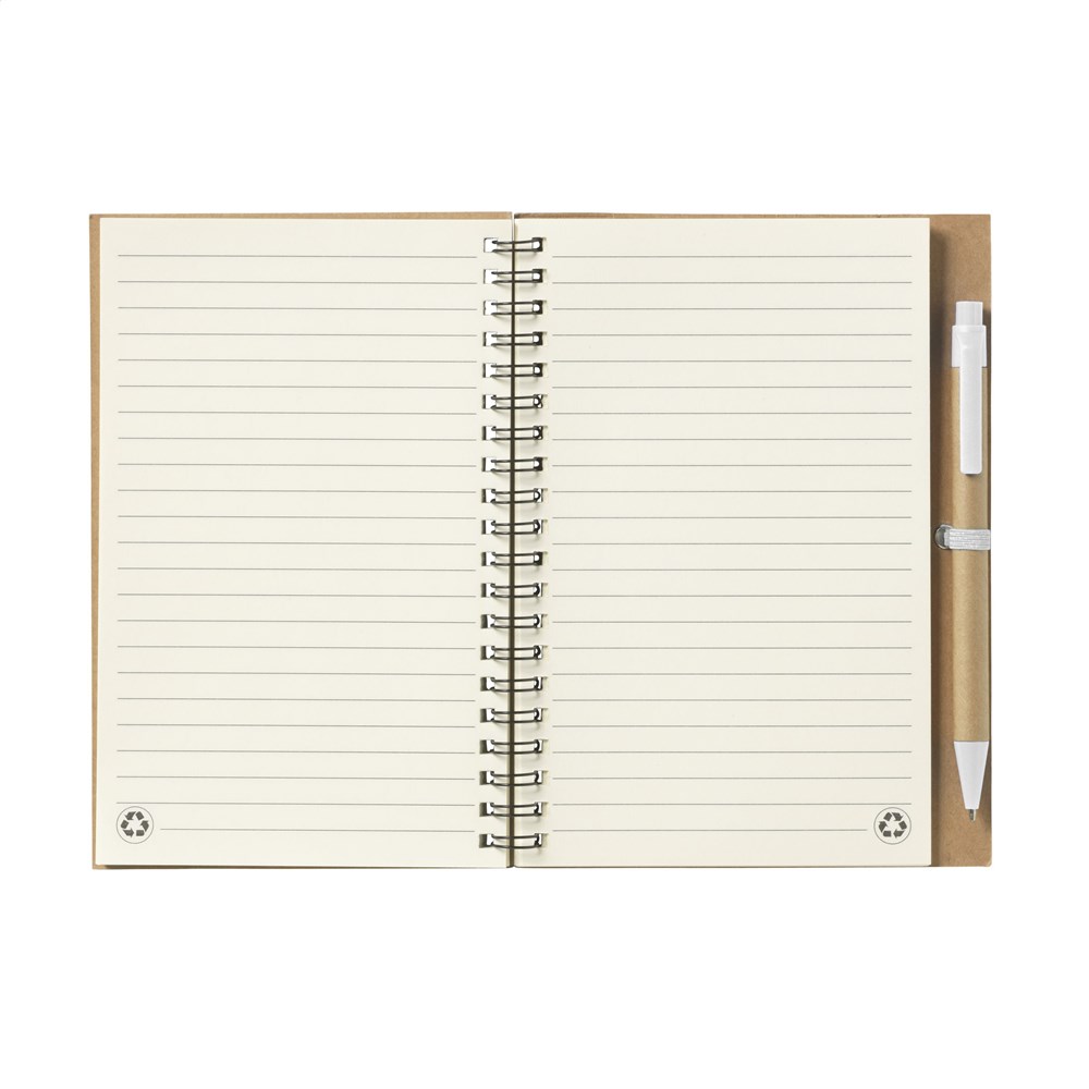 Notizbuch aus recyceltem Material mit ca. 70 Blatt/140 Seiten cremefarbenem, liniertem Papier (70 g/m²) und kartoniertem Umschlag. Gebunden in einer starken, metallenen Spiralbindung. Inkl. blauschreibendem Kugelschreiber. FSC Mix zertifiziert.