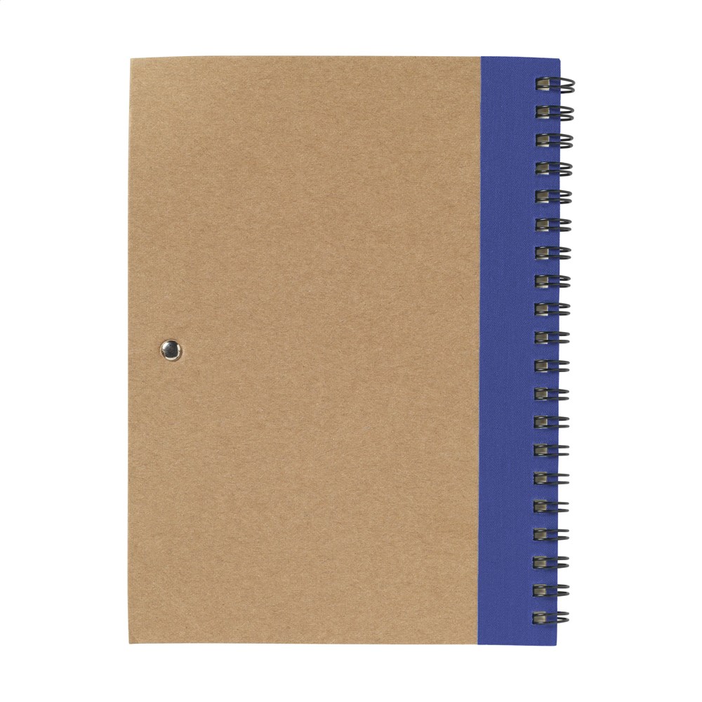 Notizbuch aus recyceltem Material mit ca. 70 Blatt/140 Seiten cremefarbenem, liniertem Papier (70 g/m²) und kartoniertem Umschlag. Gebunden in einer starken, metallenen Spiralbindung. Inkl. blauschreibendem Kugelschreiber. FSC Mix zertifiziert.