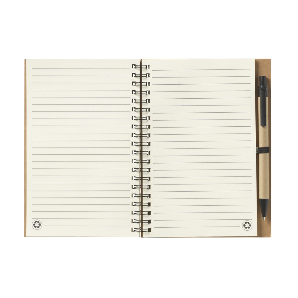 Notizbuch aus recyceltem Material mit ca. 70 Blatt/140 Seiten cremefarbenem, liniertem Papier (70 g/m²) und kartoniertem Umschlag. Gebunden in einer starken, metallenen Spiralbindung. Inkl. blauschreibendem Kugelschreiber. FSC Mix zertifiziert.