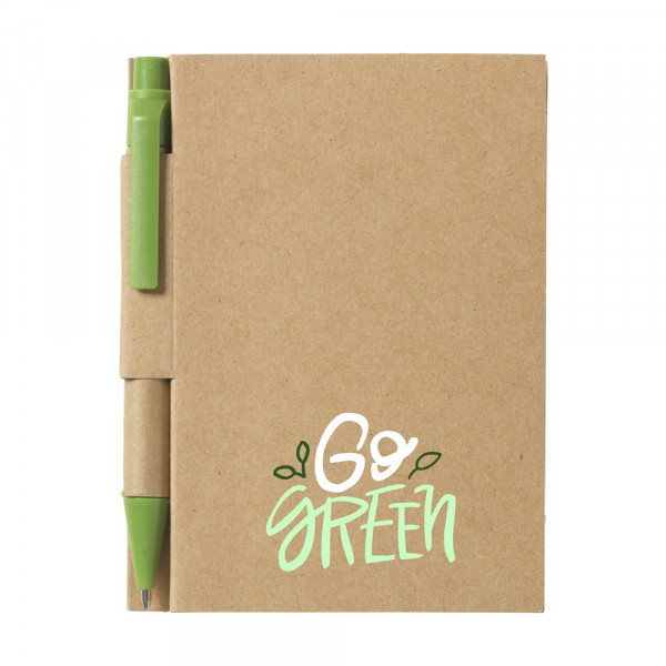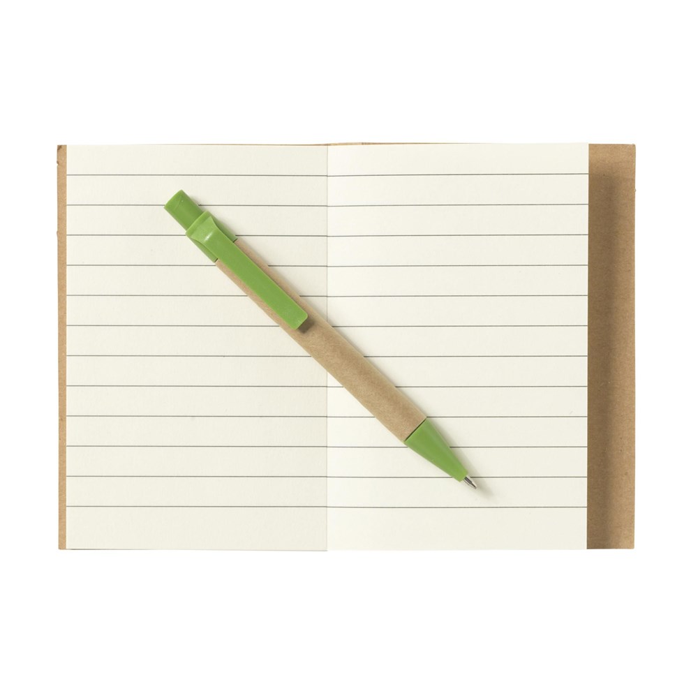 Mininotizbuch aus recyceltem Material mit ca. 80 Blatt cremefarbenem, liniertem Papier (70 g/m²), Pappumschlag und gebundenem Rücken. Inkl. blauschreibendem Kugelschreiber. FSC Mix zertifiziert.