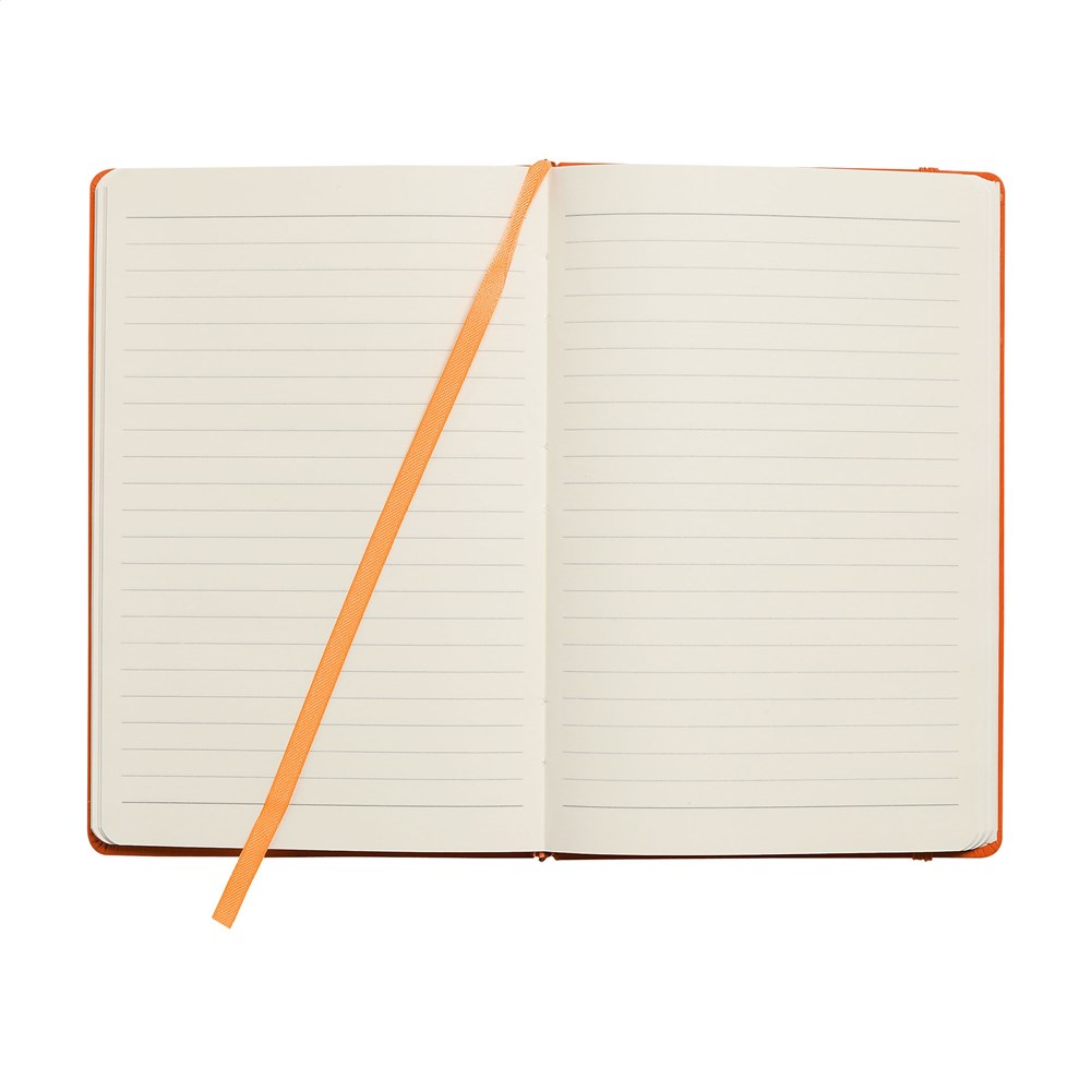 Notizbuch im A5-Format mit ca. 96 Blatt/192 Seiten crèmefarbenem, liniertem FSC Mix zertifiziertes Papier (80 g/m²). Mit gebundenem Rücken und hartem Umschlag, Verschlussgummi und seidener Leselitze.