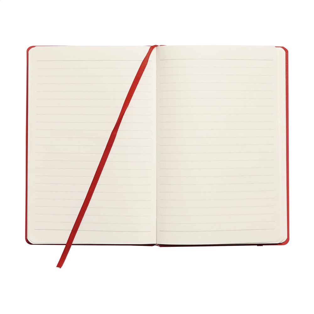 Notizbuch im A5-Format mit ca. 96 Blatt/192 Seiten crèmefarbenem, liniertem FSC Mix zertifiziertes Papier (80 g/m²). Mit gebundenem Rücken und hartem Umschlag, Verschlussgummi und seidener Leselitze.