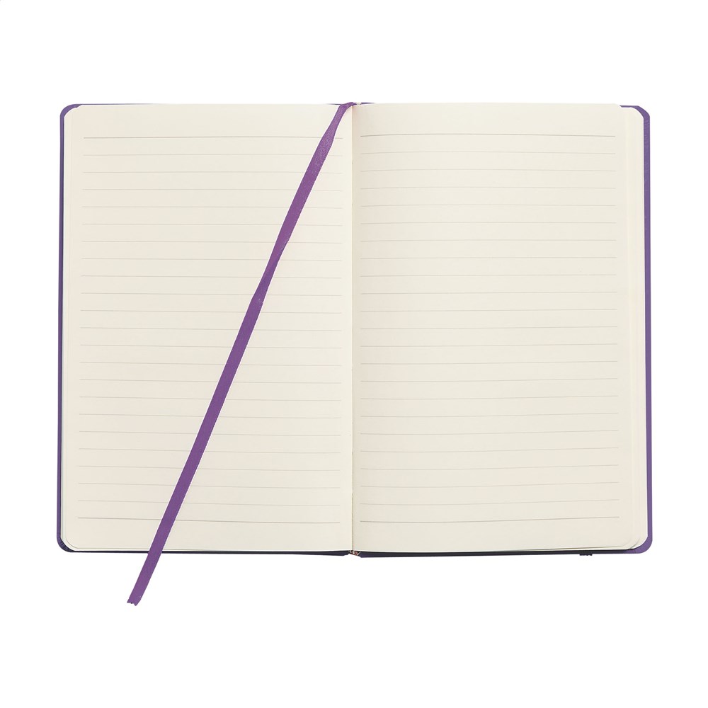 Notizbuch im A5-Format mit ca. 96 Blatt/192 Seiten crèmefarbenem, liniertem FSC Mix zertifiziertes Papier (80 g/m²). Mit gebundenem Rücken und hartem Umschlag, Verschlussgummi und seidener Leselitze.