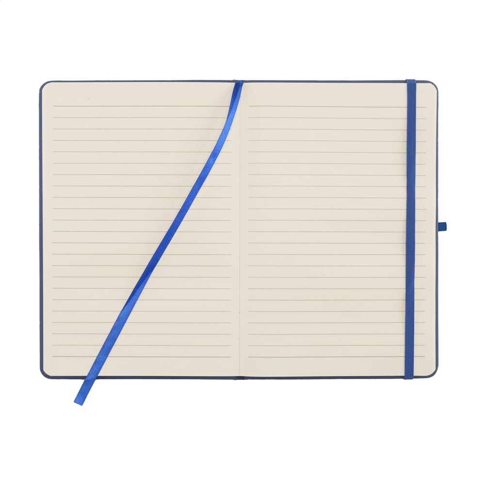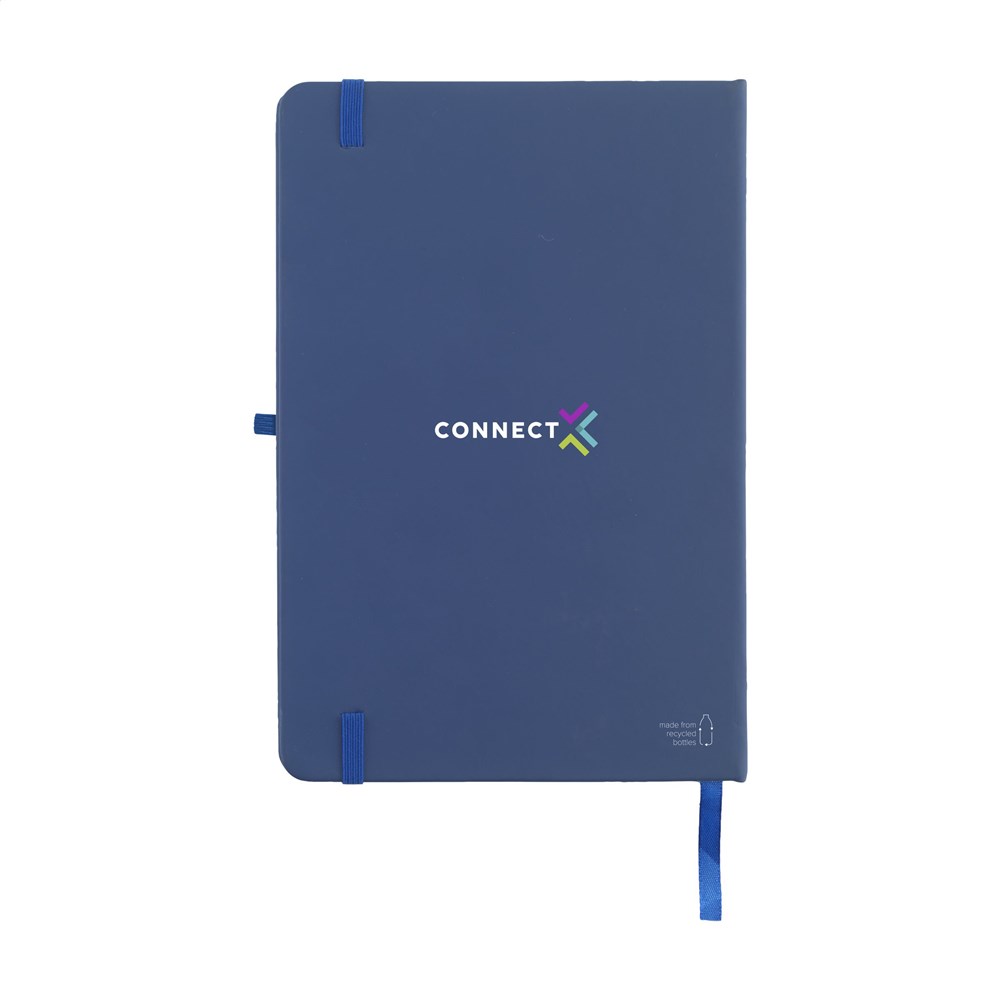 Praktisches Notizbuch im A5-Format. Mit hartem RPET-Cover und ca. 80 Blatt/160 Seiten cremefarbenem, liniertem Papier (70 g/m²). Mit praktischem Verschlussgummiband, Lesezeichen und Stiftschlaufe.