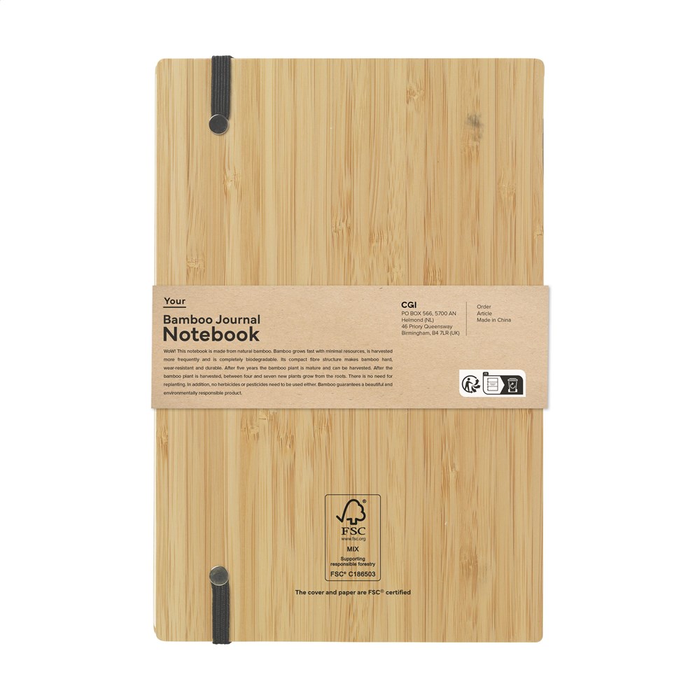 Notizbuch im A5-Format mit stabilem, Hardcover aus FSC 100% zertifiziertem Bambus. Besonders auffallend ist die so genannte „Naked Spine“-Bindung. Diese wurde speziell entwickelt, um das Notizbuch vollständig öffnen und so flach wie möglich hinlegen zu können. So lassen sich Notizen und Skizzen leichter anfertigen. Mit praktischem Verschlussgummi und ca. 96 Blatt/192 Seiten cremefarbenem, liniertem, FSC Mix zertifiziertem Papier (70 g/m²).