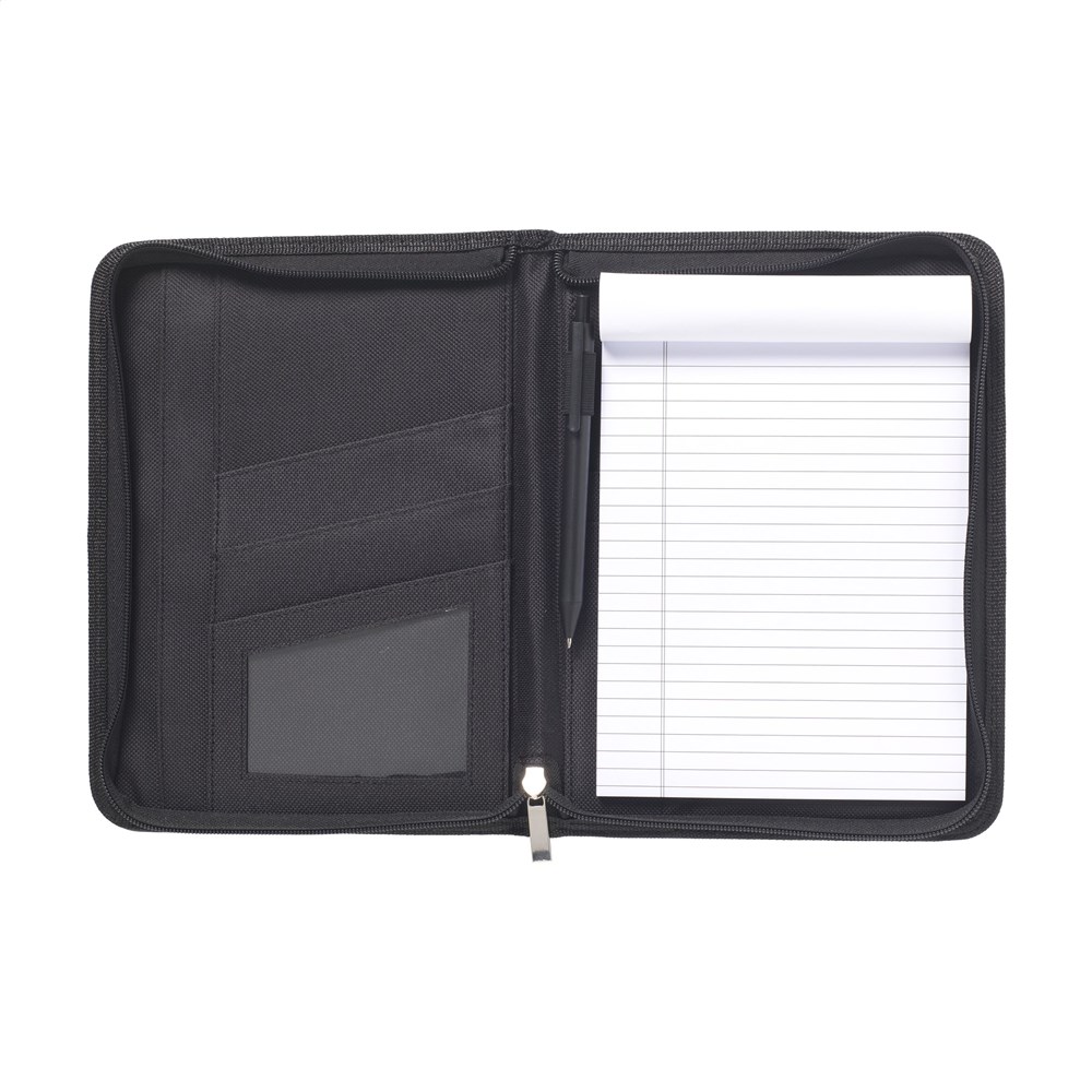 Schreibmappe/Dokumentenmapp aus fein gebundenem Leder, im DIN A5-Format. Mit diversen Einsteckfächern und Rundum-Reißverschluss. Inkl. FSC Mix zertifiziertem Schreibblock und Kugelschreiber. Verpackt pro Stück.