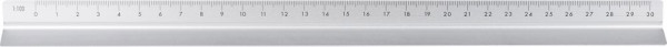 Aluminium-Dreiecklineal mit mehreren Maßskalen (1:20, 1:25, 1:50, 1:75 und 1:100) und einer Seite ohne Skala zum Gravieren. Mit Zentimeter- und Zollmarkierungen. Es ist einzeln in einem braunen Karton verpackt.