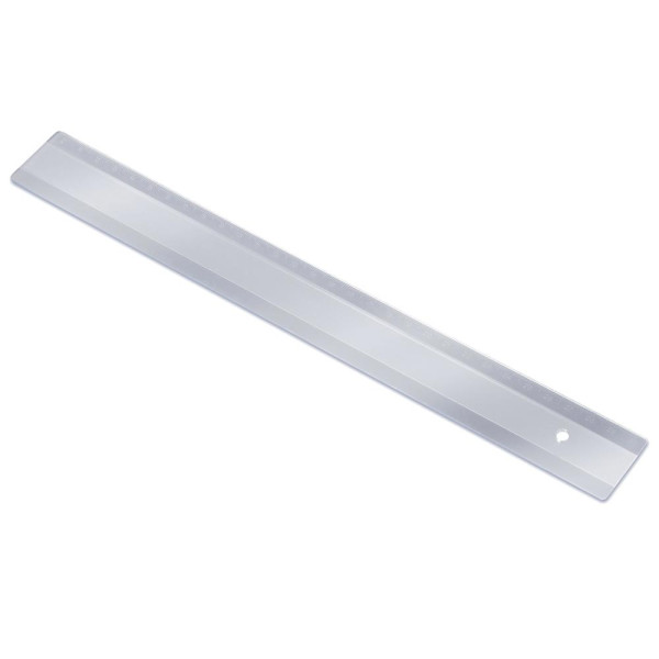 Stabiles 30 cm langes Lineal aus Kunststoff mit erhaben geprägter mm-Skala auf einer Seite. Standardmäßig ohne Druck. Loch auf einer Seite.