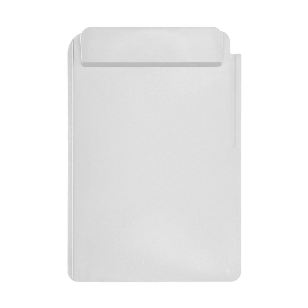 DIN A4 Klemmbrett mit Anlegeleiste, Klemme mit Kunststofffederung, Visitenkartenhalterung oberhalb der Klemme, Stifteinkerbung und Skalierung. Lieferung ohne Accessoires.