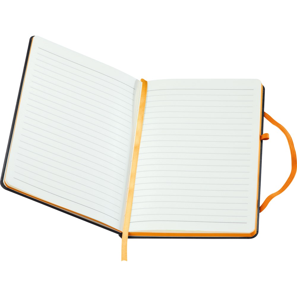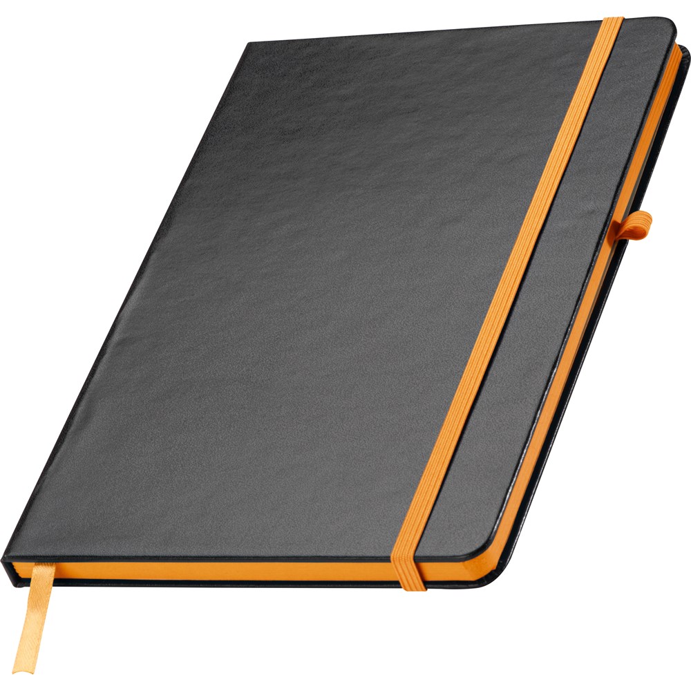 A5 Notizbuch im PU-Einband, Kugelschreiberschlaufe, Gummiverschlussband, Lesezeichen und 160 linierten Seiten. Der Werbeaufdruck erfolgt mittig auf der Vorderseite.