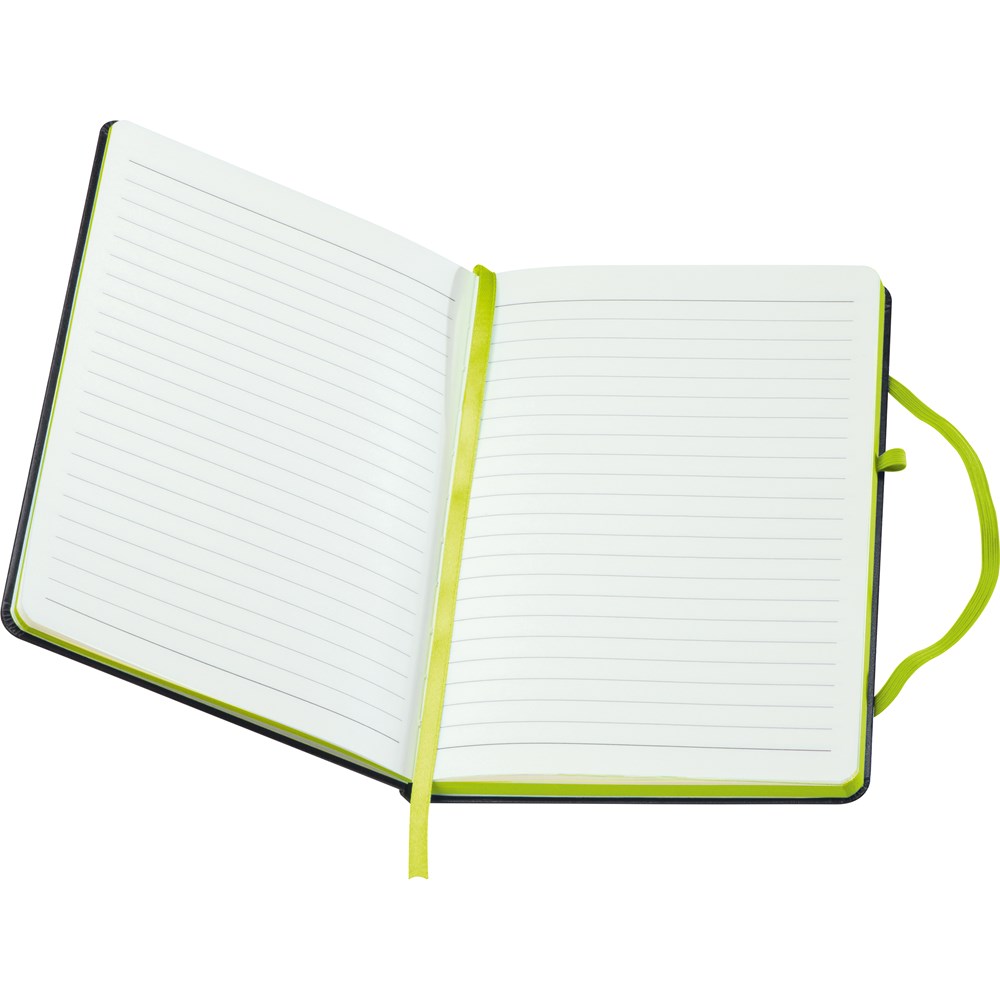 A5 Notizbuch im PU-Einband, Kugelschreiberschlaufe, Gummiverschlussband, Lesezeichen und 160 linierten Seiten. Der Werbeaufdruck erfolgt mittig auf der Vorderseite.