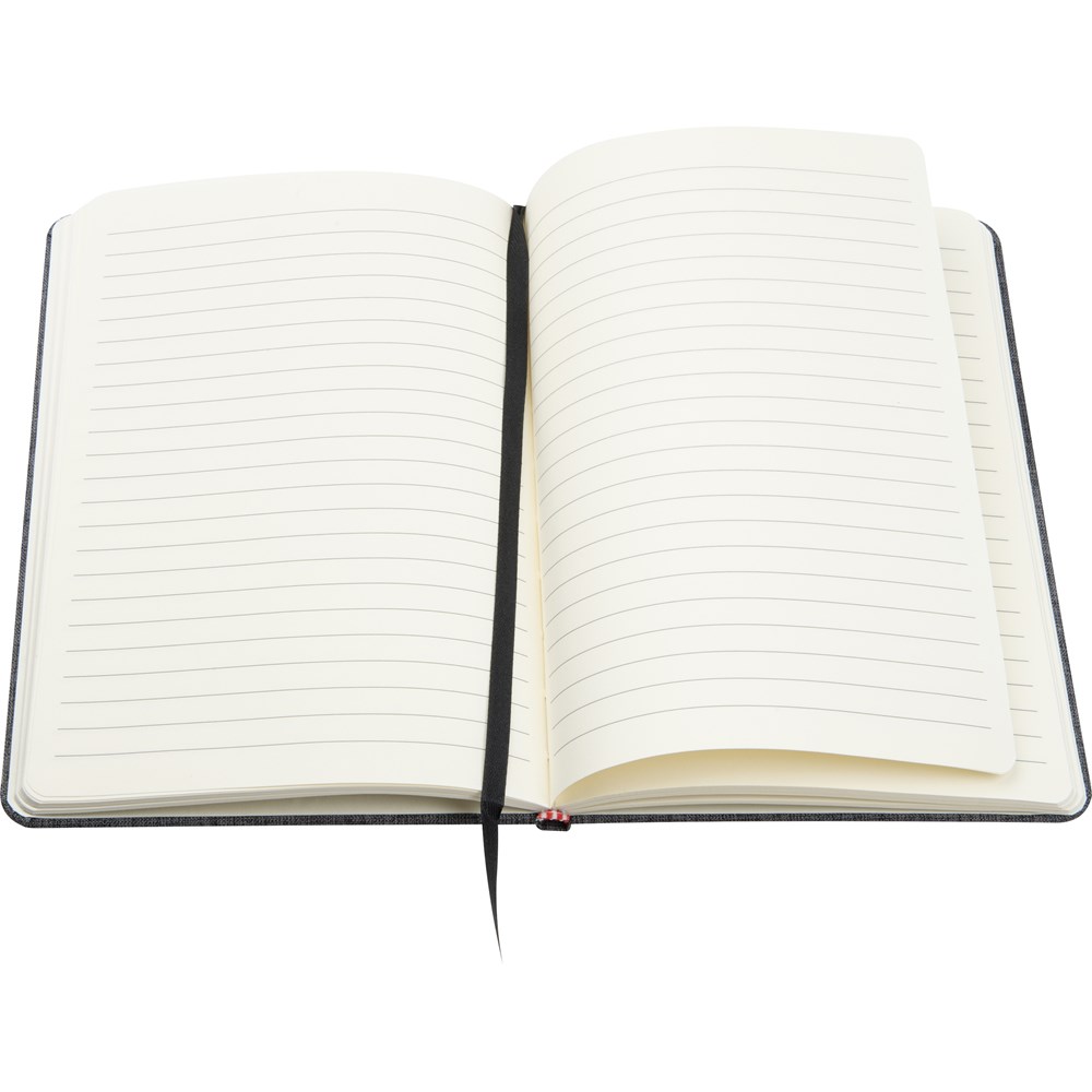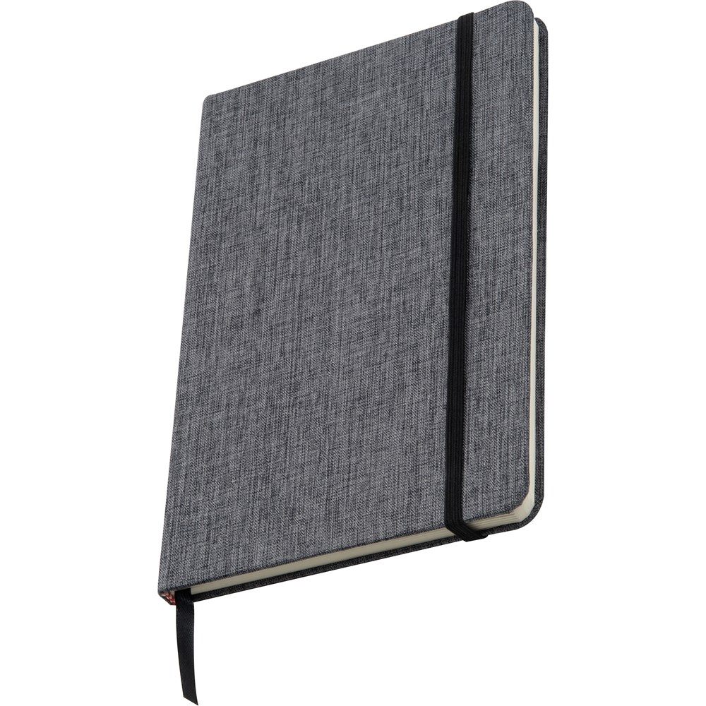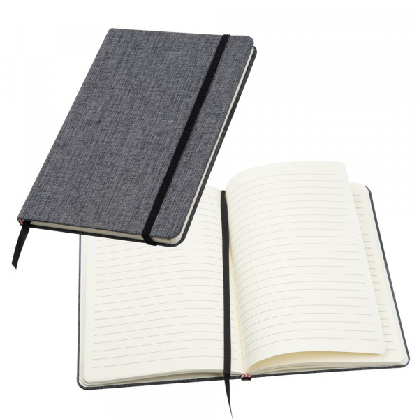 A5 Notizbuch im Umschlag aus strapazierfähigem Stoff, sowie einem schwarzen Verschlussgummi und einem Lesezeichen. Innen befinden sich 160 linierte Seiten. Wir drucken mittig auf den Einband.