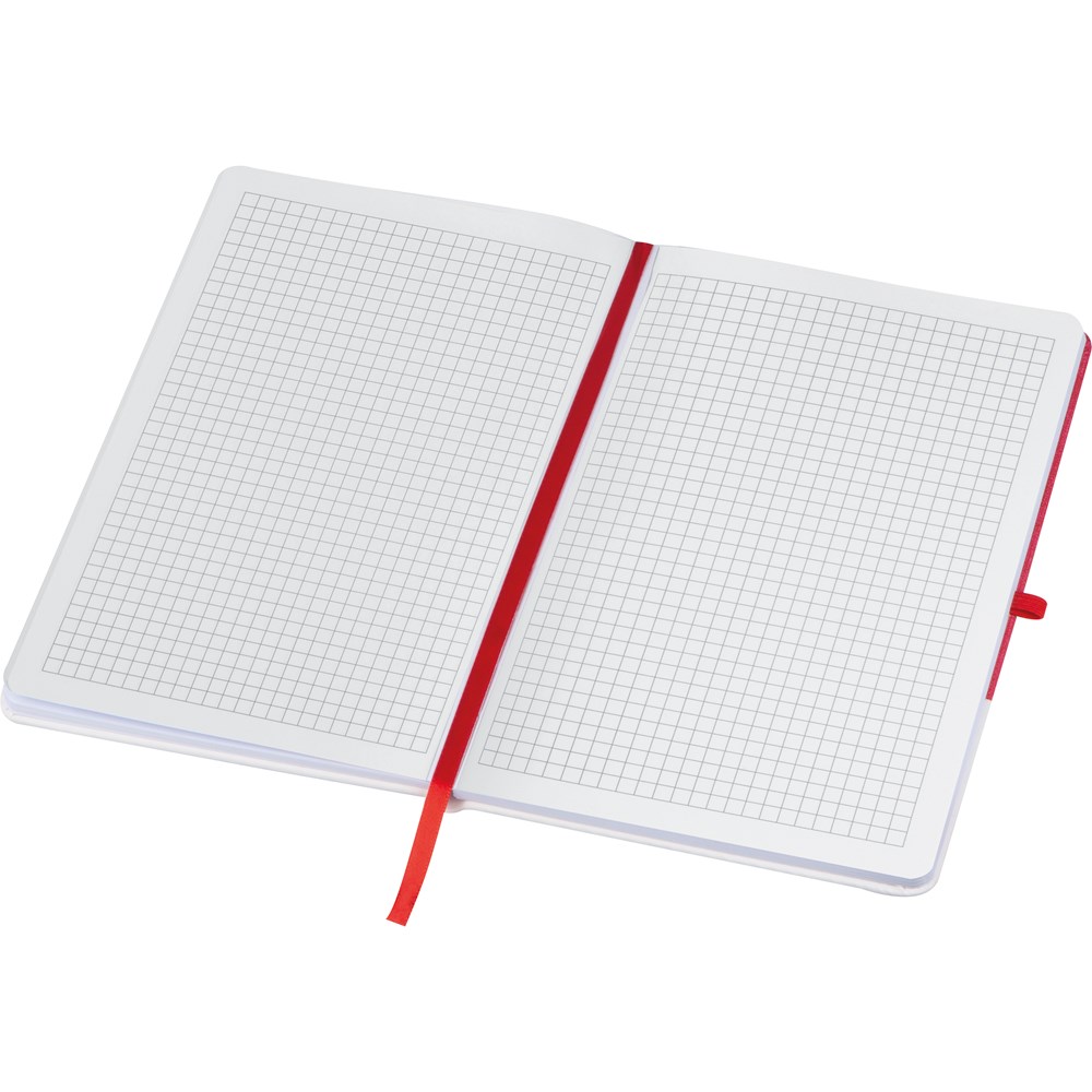 A5 Notizbuch mit 160 karierten Seiten, PU-Cover, Lesezeichen, Kugelschreiberschlaufe und elastischem Verschlußgummi. Ihre Werbung drucken wir auf die weiße Fläche.
