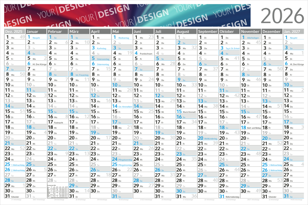 Der Wandplaner Horizont Bestseller vereint Übersichtlichkeit, Funktionalität und Werbewirkung in einem zeitlosen Design. Als langlebiger Klassiker bietet er eine klare Monatsübersicht über 14 Monate und eine optimale Präsentationsfläche für das Logo und die Botschaft.