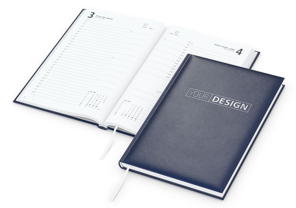 Der Basic Balacron Prägung Bestseller kombiniert Funktionalität und hochwertige Verarbeitung in einem preiswerten Buchkalender. Perfekt für Unternehmen, die ein elegantes und dennoch praktisches Werbemittel suchen. • Format: 148 × 210 mm gesamt (DIN A5); 142 × 205 mm Kalenderblock • Kalendarium: Deutsch 3sprachig D/GB/F; je Tag eine Seite; Samstag und Sonntag zusammengefasst; Halbstunden-Einteilung von 7 bis 22 Uhr; Informationsteil • Umfang: 320 Seiten • Verarbeitung: Hardcover mit wattierter Buchdecke; Eckenperforation; Lesezeichen; Kapitalband; runder Rücken • Einband: Balacron • Werbefläche: 100 × 50 mm • Druck: Prägung inklusive (zzgl. Prägestempelkosten)