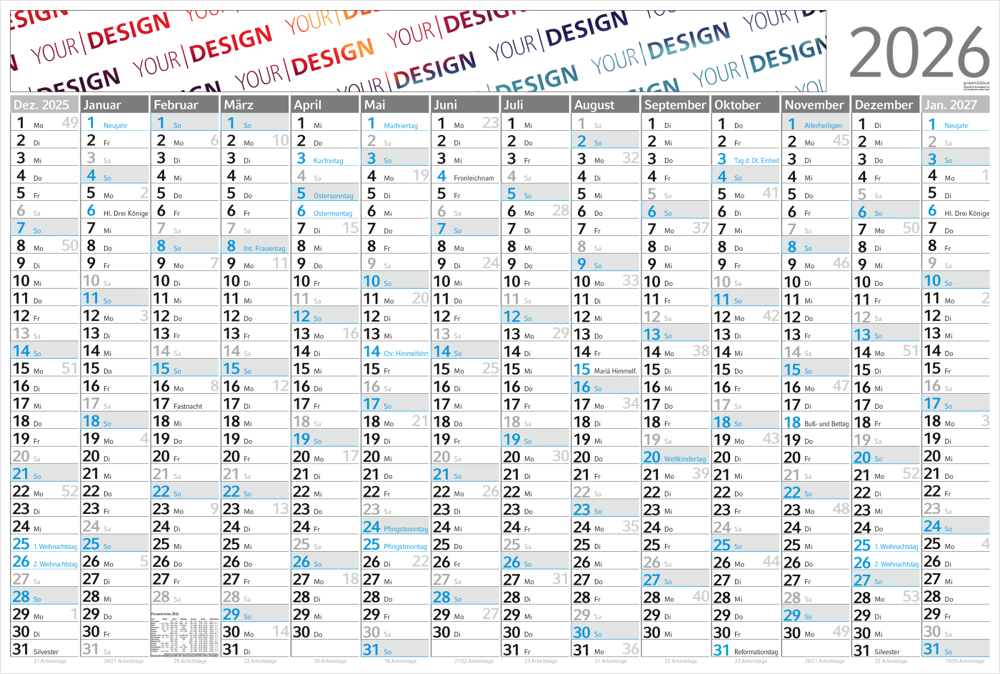 • Kalendarium: Deutsch 1sprachig; 14 Monate: Dez. – Jan.; Jahreszahl (anthrazit)