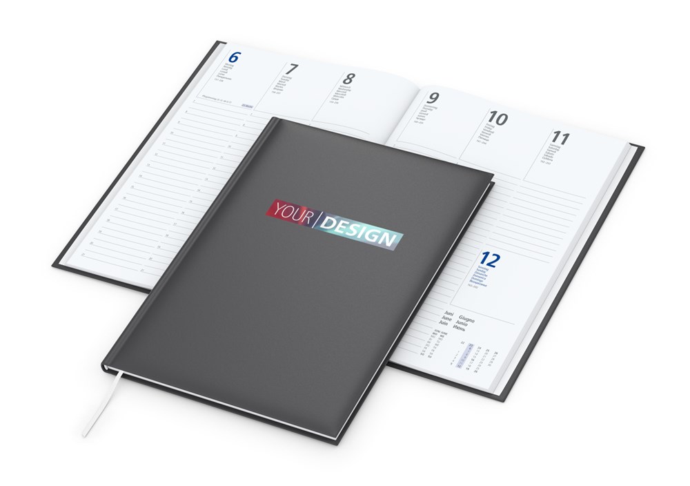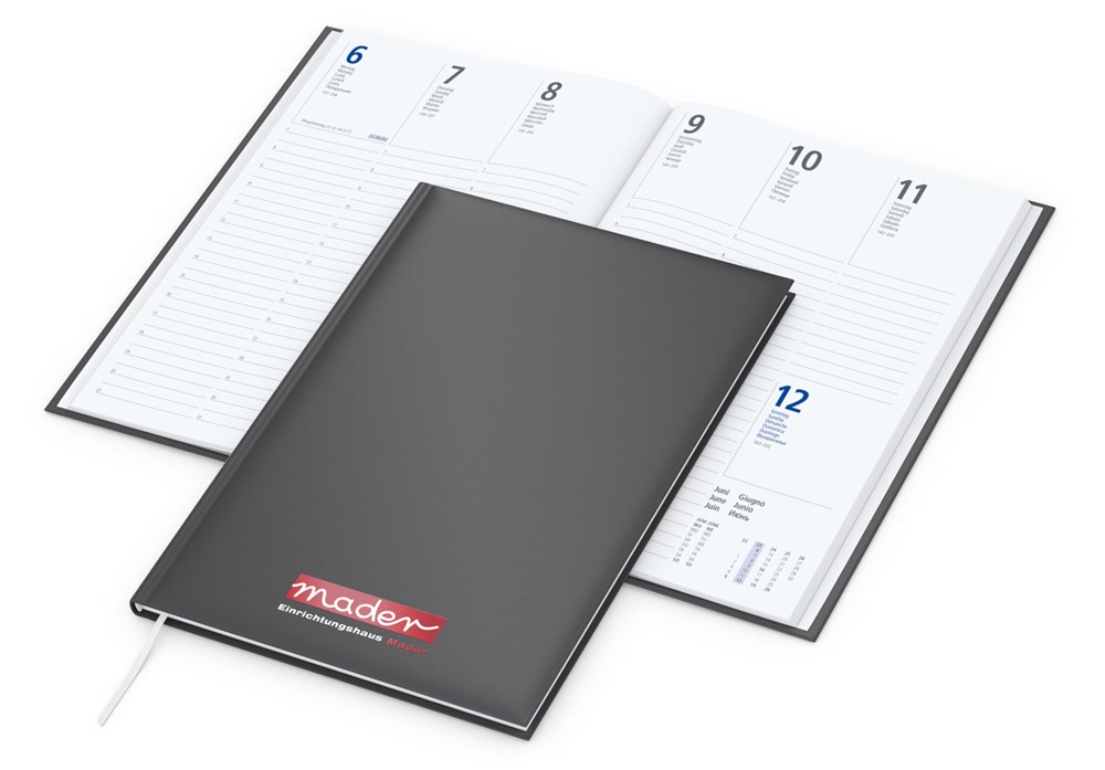 Professionell und flexibel: Der Media Future Siebdruck-Digital Bestseller ist ein Mittelformat-Wochentimer, der mit einem edlen anthrazitfarbenen Design, individuell bedruckbarer Werbefläche und einem klar strukturierten Kalendarium überzeugt. Ideal für den Arbeitsalltag und als hochwertiges Werbegeschenk. • Format: 175 × 245 mm gesamt; 170 × 240 mm Kalenderblock • Kalendarium: Deutsch 6sprachig D/GB/F/I/E/NL; je Woche 2 Seiten; Stundeneinteilung von 7 bis 21 Uhr; Informationsteil • Umfang: 128 Seiten • Verarbeitung: Hardcover mit wattierter Buchdecke; Lesezeichen; Kapitalband; runder Rücken • Einband: Future anthrazit • Werbefläche: 100 × 50 mm • Druck: Siebdruck-Digital inklusive