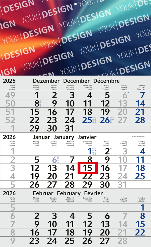 Der Budget 3 Bestseller ist der ideale Kalender für kostenbewusste Unternehmen, die auf Übersicht und Werbewirkung setzen. Mit einem modernen 3-Monatskalendarium, klarer Typografie und einem individuell bedruckbaren Kopfteil kombiniert er Funktionalität mit attraktivem Design. Ein zuverlässiges Werbemittel, „Made in Germany“. • Format: 300 × 490 mm gesamt; 300 × 350 mm Kalendarium • Kalendarium: Deutsch 3sprachig D/GB/F hellgrau • Ausstattung: Datumsschieber rot • Werbefläche: am Kopf • Druck: 4C-Quality Digital inklusive