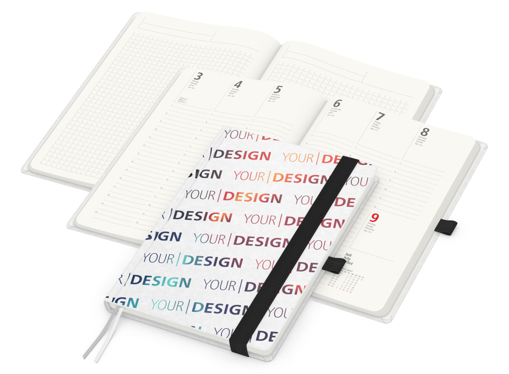 Der Match-Hybrid green+blue vereint Nachhaltigkeit und Funktionalität in einem hochwertigen Design. Gefertigt aus Recyclingpapier mit dem Umweltzeichen „Blauer Engel“, ist er perfekt für Unternehmen, die Wert auf umweltfreundliche Werbemittel legen. • Format: 148 × 210 mm für A5 (Blattformat) • Kalendarium: Deutsch 3sprachig D/GB/F; je Woche 2 Seiten • Umfang: 192 Seiten plus Einstecktasche; 128 Seiten Kalendarium; 64 Seiten Notizen • Verarbeitung: Hardcover mit unwattierter Buchdecke; Buchblock und -decke mit abgerundeten Ecken; Eckenperforation; 2 Lesezeichen; Kapitalband; runder Rücken • Ausstattung: Notizseiten mit Winkelkaro und Mikroperforation; Einstecktasche; Gummiband 15 mm und Stiftschlaufe farbig • Einband: Recycling, individuell • Material: Recyclingpapier – hergestellt aus 100 % Altpapier – Inhaltspapier mit dem Umweltzeichen „Blauer Engel“ • Werbefläche: kompletter Einband • Druck: 4C-Quality Digital inklusive