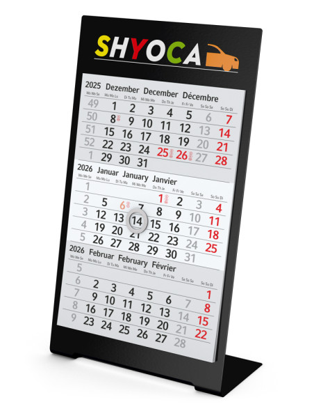Der Desktop 3 Color Bestseller verbindet modernes Design mit Funktionalität in einem hochwertigen Tischkalender. Mit einem farbig pulverbeschichteten Metallaufsteller und einem magnetischen Kalenderblock ist dieser Kalender sowohl praktisch als auch optisch ansprechend. Die individuelle Werbefläche und die hochwertige Verarbeitung machen ihn zu einem idealen Werbemittel für anspruchsvolle Unternehmen. Hergestellt in Deutschland, steht der Kalender für Qualität und Präzision. • Format: 105 × 230 mm gesamt (inkl. 50 mm Aufsteller-Fuß); 95 × 135 mm Kalendarium • Kalendarium: Deutsch 3sprachig D/GB/F hellgrau • Verarbeitung: Kalenderblocks mit Kopfleimung haften magnetisch auf dem pulverbeschichteten Metallaufsteller • Ausstattung: auf steller aus Metall (plano geliefert); Ringmagnet als Datumsschieber • Werbefläche: am Kopf • Druck: Siebdruck-Digital inklusive