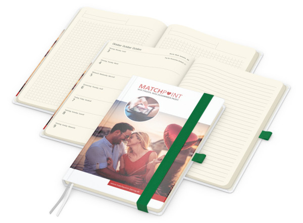 Der Hybrid-Wochentimer Match-Hybrid Creme Bestseller überzeugt durch Funktionalität, hochwertiges Design und die Möglichkeit zur individuellen Gestaltung. Dieser vielseitige Kalender ist die ideale Lösung für Unternehmen, die praktische Werbegeschenke mit einem hohen Nutzwert suchen. • Format: 148 × 210 mm für A5 (Blattformat) • Kalendarium: Wochenkalendarium Creme Deutsch 3sprachig D/GB/F; je Woche 1 Seite: links Wochenübersicht, rechts linierte Notizseite • Umfang: 192 Seiten plus Einstecktasche; 160 Seiten Kalendarium (August 2025 – Dezember 2026), links Wochenübersicht, rechts linierte Notizseite; 32 zusätzliche Notizseiten am Ende • Verarbeitung: Hardcover mit unwattierter Buchdecke; Buchblock und -decke mit abgerundeten Ecken; 2 Lesezeichen; Kapitalband; runder Rücken • Ausstattung: Notizseiten mit Winkelkaro und Mikroperforation; Notizseiten im Kalendariumsteil liniert; Einstecktasche; Gummiband 15 mm und Stiftschlaufe farbig • Einband: individuell • Material: Schreibpapier 90 g/m² • Werbefläche: kompletter Einband • Druck: 4C-Quality Digital inklusive