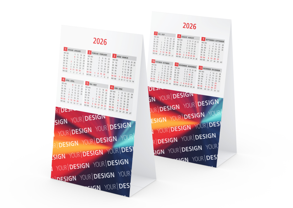 Preisgünstiger Aufstellkalender Table Compact Bestseller für den Schreibtisch – mit funktionalem 6-Monats-Kalendarium und großzügiger Werbefläche. • Format: 98 × 162 mm zusammengesteckt; 98 × 422 mm offen; 98 × 85 mm Kalendarium je Seite • Kalendarium: Deutsch 2sprachig D/GB hellgrau/rot • Ausstattung: dreieckiger Dachaufsteller auf Karton • Material: Chromosulfatkarton 350 g/m² • Werbefläche: auf der unteren Hälfte von Vorder- und Rückseite • Druck: 4C-Quality Digital inklusive