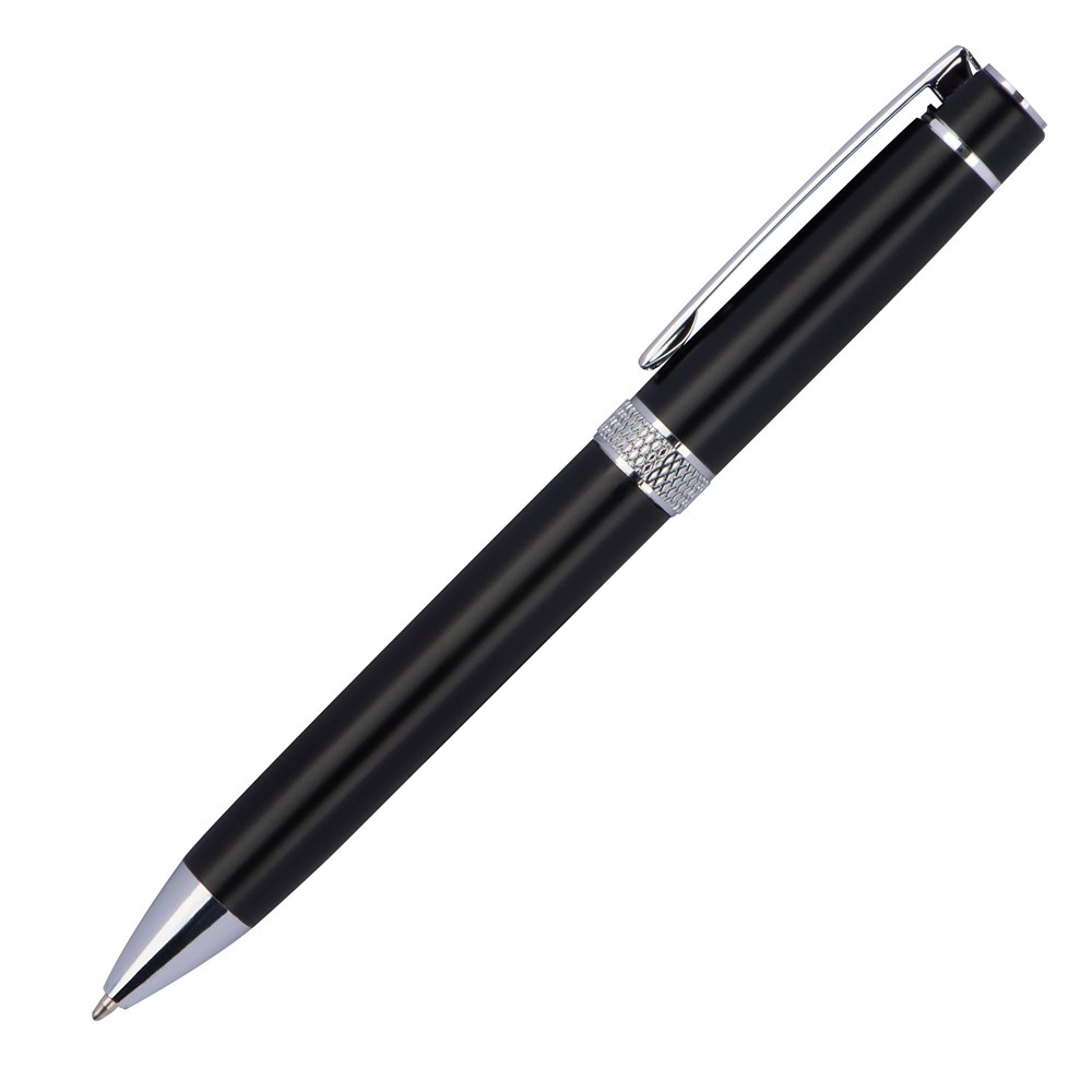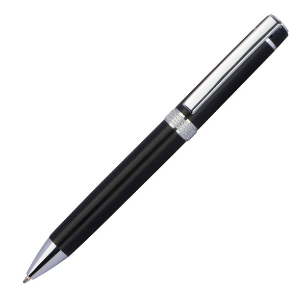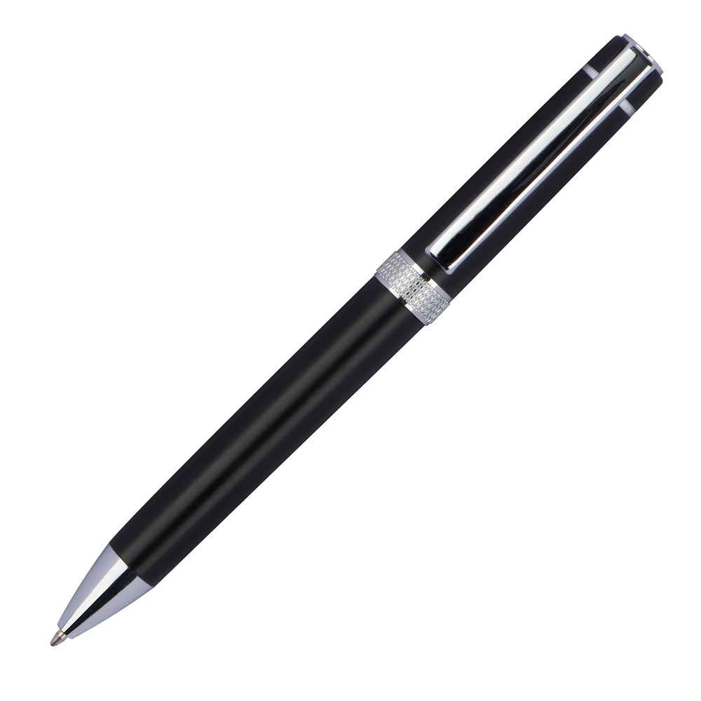 Drehkugelschreiber aus Aluminium mit blauschreibender Systemmine. Die verchromten Applikationen sowie der funkelnde Zierring geben dem Stift seine besondere Optik. Ihre Werbung wird rechts vom Clip graviert.