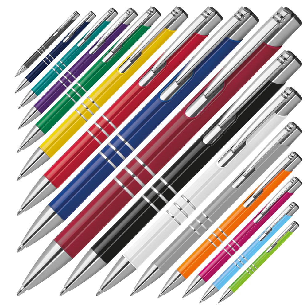 TOP PRICE! Farbig lackierter Kugelschreiber aus Aluminium mit 3 Zierringen und blauschreibender Großraummine. Die Werbung wird mittels Gravur rechts vom Clip angebracht.