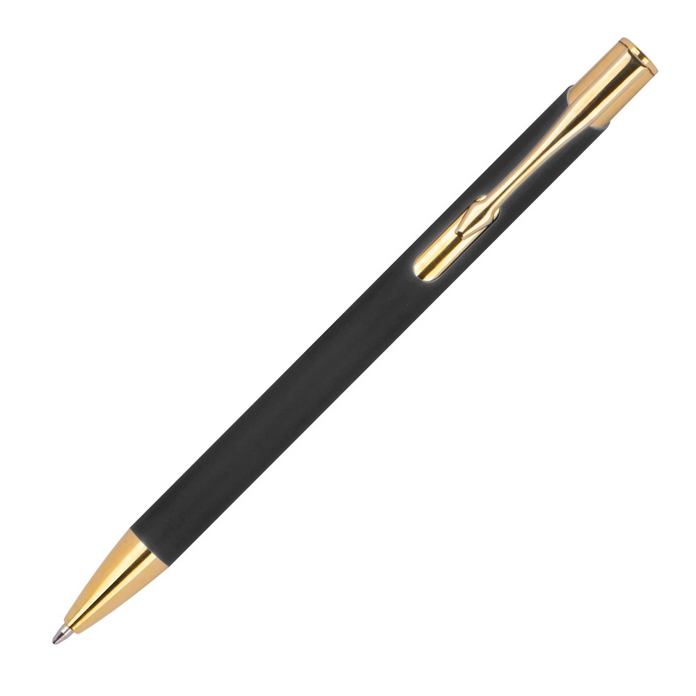 TOP PRICE! Kugelschreiber aus Aluminium mit goldenen Applikationen, rubber finish und blauschreibender Großraummine. Ihre Werbung lasern wird rechts vom Clip, diese erscheint goldfarben.