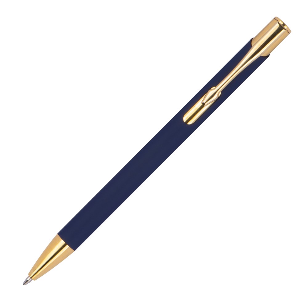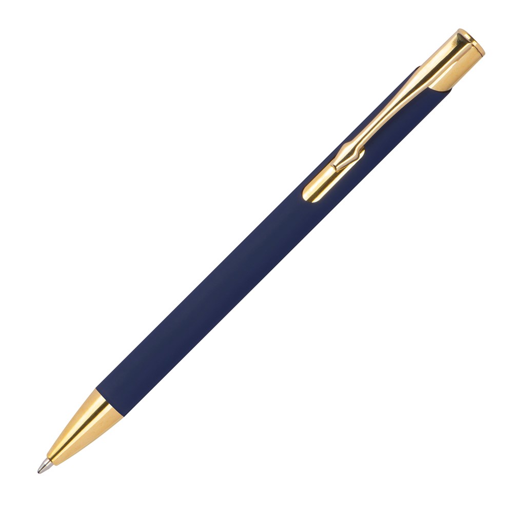 TOP PRICE! Kugelschreiber aus Aluminium mit goldenen Applikationen, rubber finish und blauschreibender Großraummine. Ihre Werbung lasern wird rechts vom Clip, diese erscheint goldfarben.