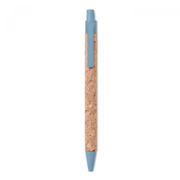 Druckkugelschreiber mit Schaft aus Kork. Clip, Drücker, Spitze aus umweltfreundlichen Weizenstrohhalm- und ABS-Kunststoff Gemisch (je 50%). Blaue Tinte. Kork ist ein natürliches Material, aufgrund seiner strukturellen Beschaffenheit und Oberflächenporosität kann das Druckergebnis pro Artikel Abweichungen aufweisen.