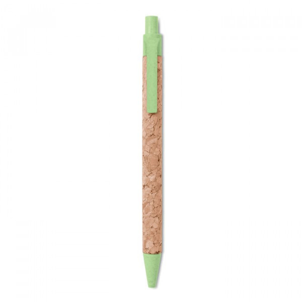 Druckkugelschreiber mit Schaft aus Kork. Clip, Drücker, Spitze aus umweltfreundlichen Weizenstrohhalm- und ABS-Kunststoff Gemisch (je 50%). Blaue Tinte. Kork ist ein natürliches Material, aufgrund seiner strukturellen Beschaffenheit und Oberflächenporosität kann das Druckergebnis pro Artikel Abweichungen aufweisen.