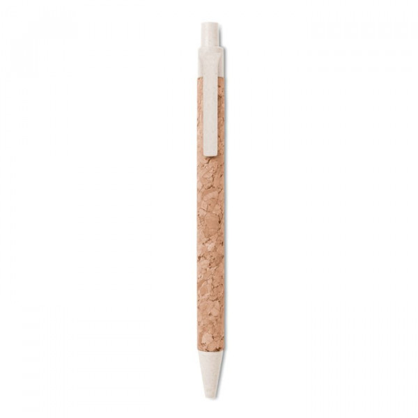 Druckkugelschreiber mit Schaft aus Kork. Clip, Drücker, Spitze aus umweltfreundlichen Weizenstrohhalm- und ABS-Kunststoff Gemisch (je 50%). Blaue Tinte. Kork ist ein natürliches Material, aufgrund seiner strukturellen Beschaffenheit und Oberflächenporosität kann das Druckergebnis pro Artikel Abweichungen aufweisen.