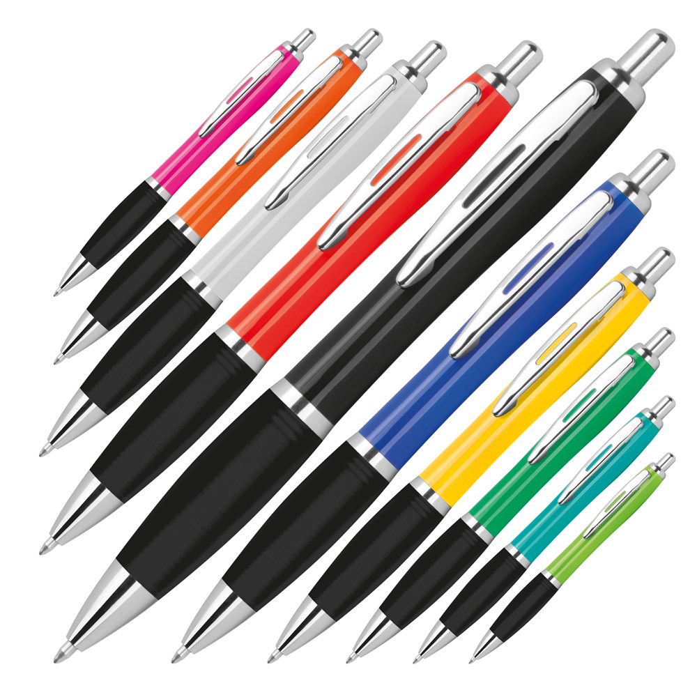 Kugelschreiber aus recyceltem ABS mit gummierter Griffzone. Er verfügt über eine blauschreibende Großraummine. Ihre Werbung drucken wir rechts vom Clip.