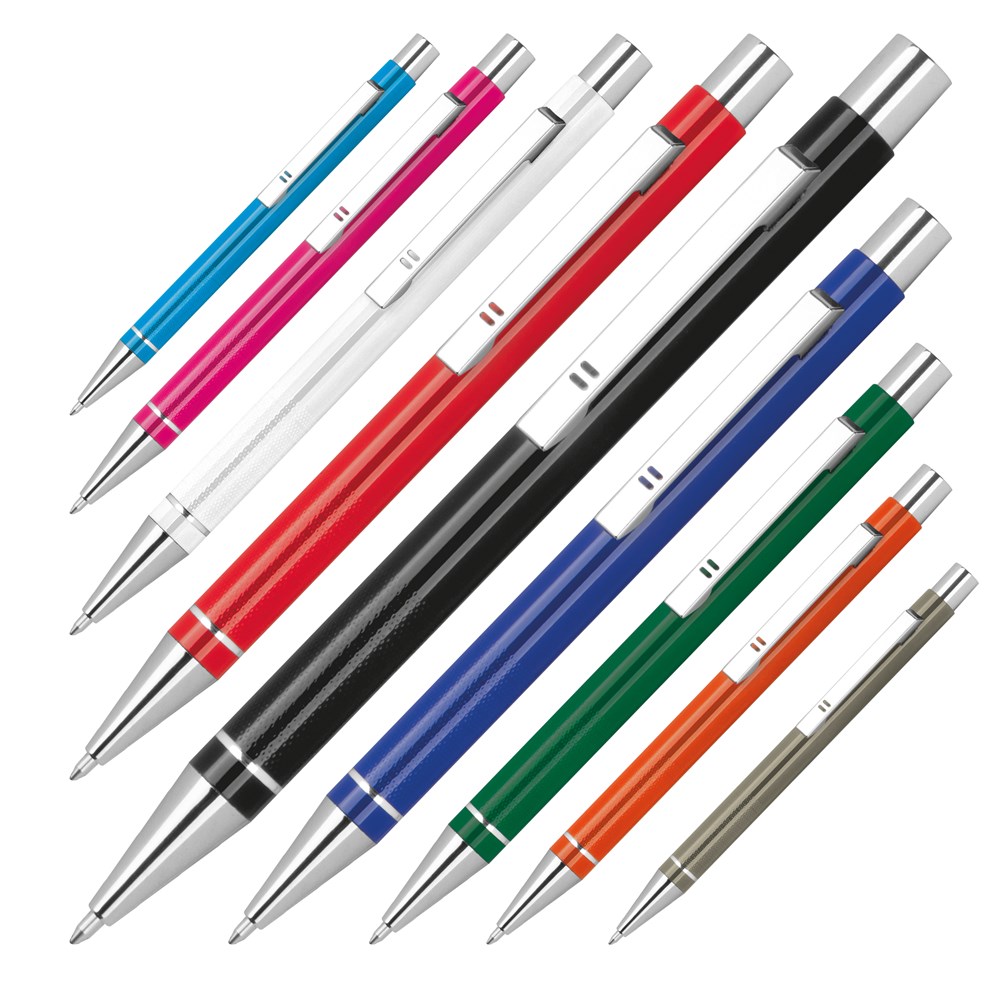 Metall Schreibgerät mit blauschreibender Semi Gelmine (1 mm Tip) und geriffelter Griffzone. Ihre Werbung lasern wir rechts vom Clip.
