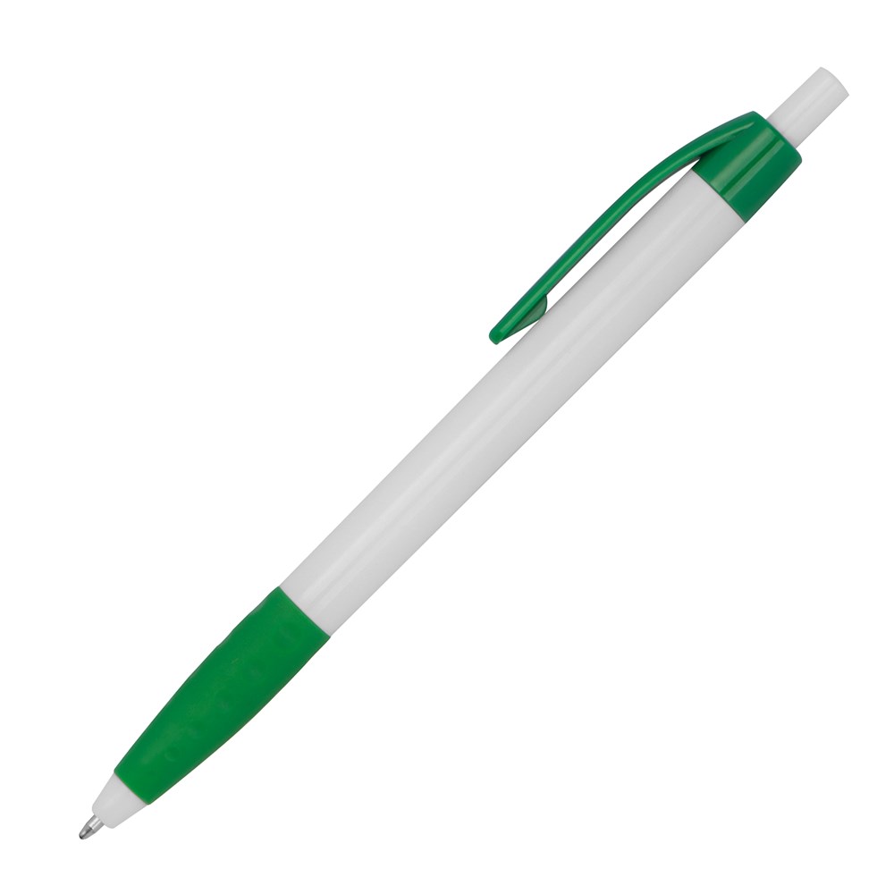 Kugelschreiber aus Kunststoff mit farbigen Akzenten und einer gummiertem Griffzone. Der Kugelschreiber verfügt über eine blauschreibende Kunststoffmine. Ihre Werbung drucken wir rechts vom Clip.