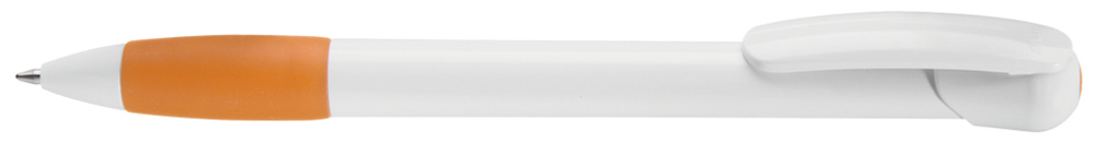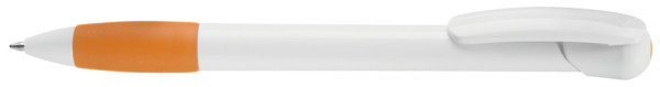 Druckkugelschreiber mit gedeckt glänzendem Gehäuse und Clipdrücker in weiß, farbige Gummigriffzone und Stopfen.