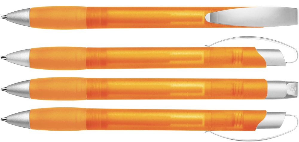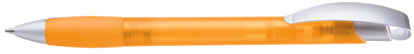 Druckkugelschreiber mit transparent gefrostetem Gehäuse, Gummigriffzone, matt verchromtem Metallclipdrücker und Spitze matt silber.