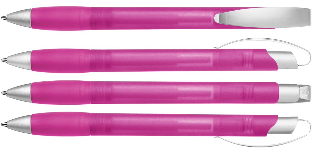 Druckkugelschreiber mit transparent gefrostetem Gehäuse, Gummigriffzone, matt verchromtem Metallclipdrücker und Spitze matt silber.