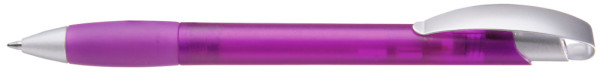 Druckkugelschreiber mit transparent gefrostetem Gehäuse, Gummigriffzone, matt verchromtem Metallclipdrücker und Spitze matt silber.