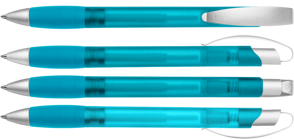 Druckkugelschreiber mit transparent gefrostetem Gehäuse, Gummigriffzone, matt verchromtem Metallclipdrücker und Spitze matt silber.