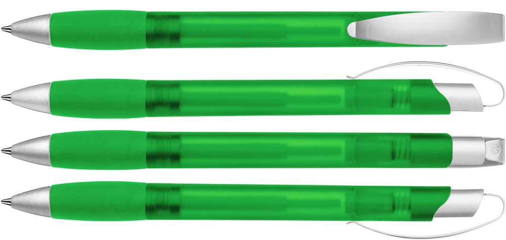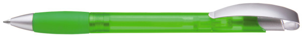 Druckkugelschreiber mit transparent gefrostetem Gehäuse, Gummigriffzone, matt verchromtem Metallclipdrücker und Spitze matt silber.