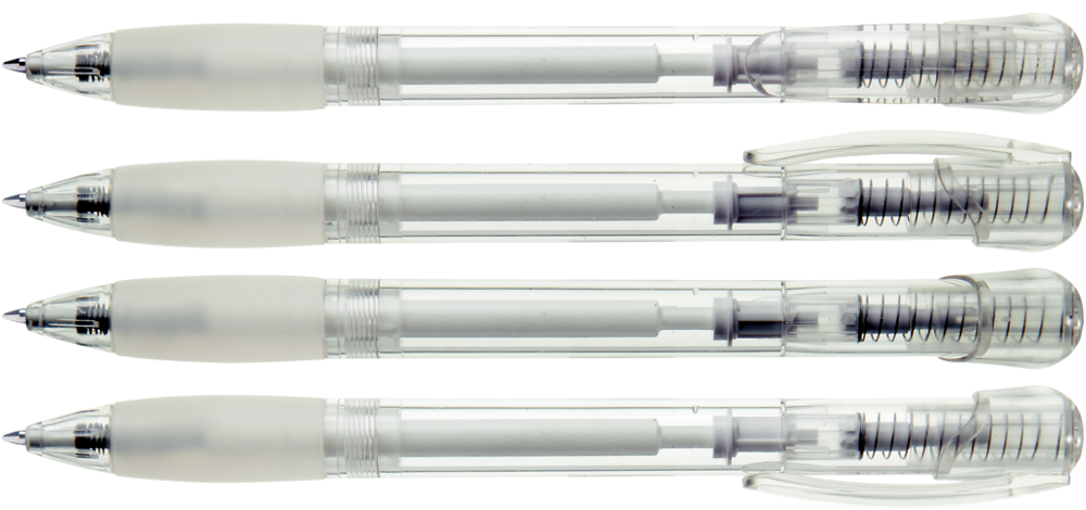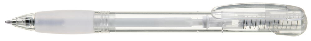 Druckkugelschreiber mit transparent glänzendem Gehäuse, Gummigriffzone und Clipdrücker. Stopfen... mehr