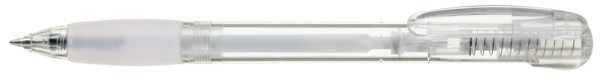 Druckkugelschreiber mit transparent glänzendem Gehäuse, Gummigriffzone und Clipdrücker. Stopfen silber metallic.