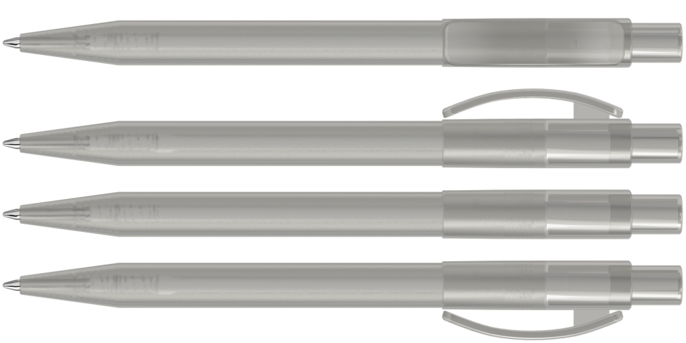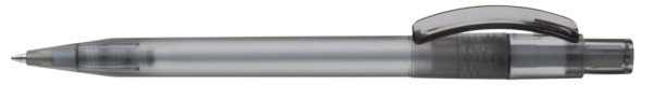Druckkugelschreiber mit gefrostetem Gehäuse, glänzend transparentem Bogenclip und Drücker.
