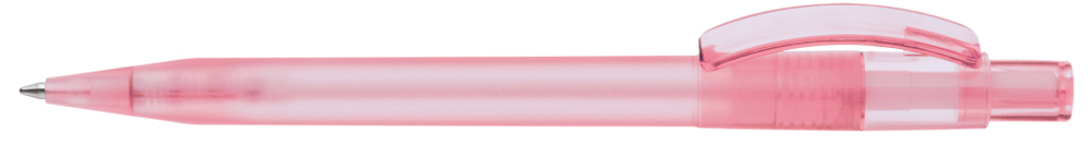 Druckkugelschreiber mit gefrostetem Gehäuse, glänzend transparentem Bogenclip und Drücker.
