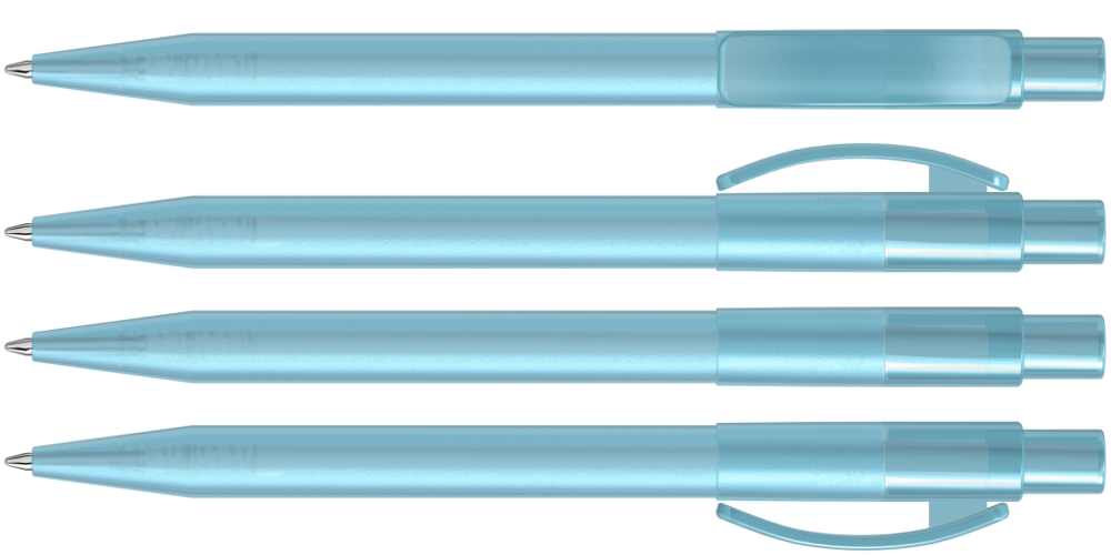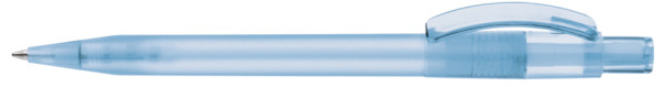 Druckkugelschreiber mit gefrostetem Gehäuse, glänzend transparentem Bogenclip und Drücker. mehr