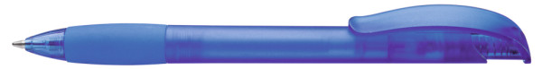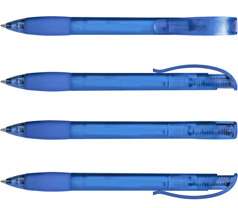 Druckkugelschreiber mit transparent gefrostetem Gehäuse, Gummigriffzone und Clipdrücker mit Stopfen.