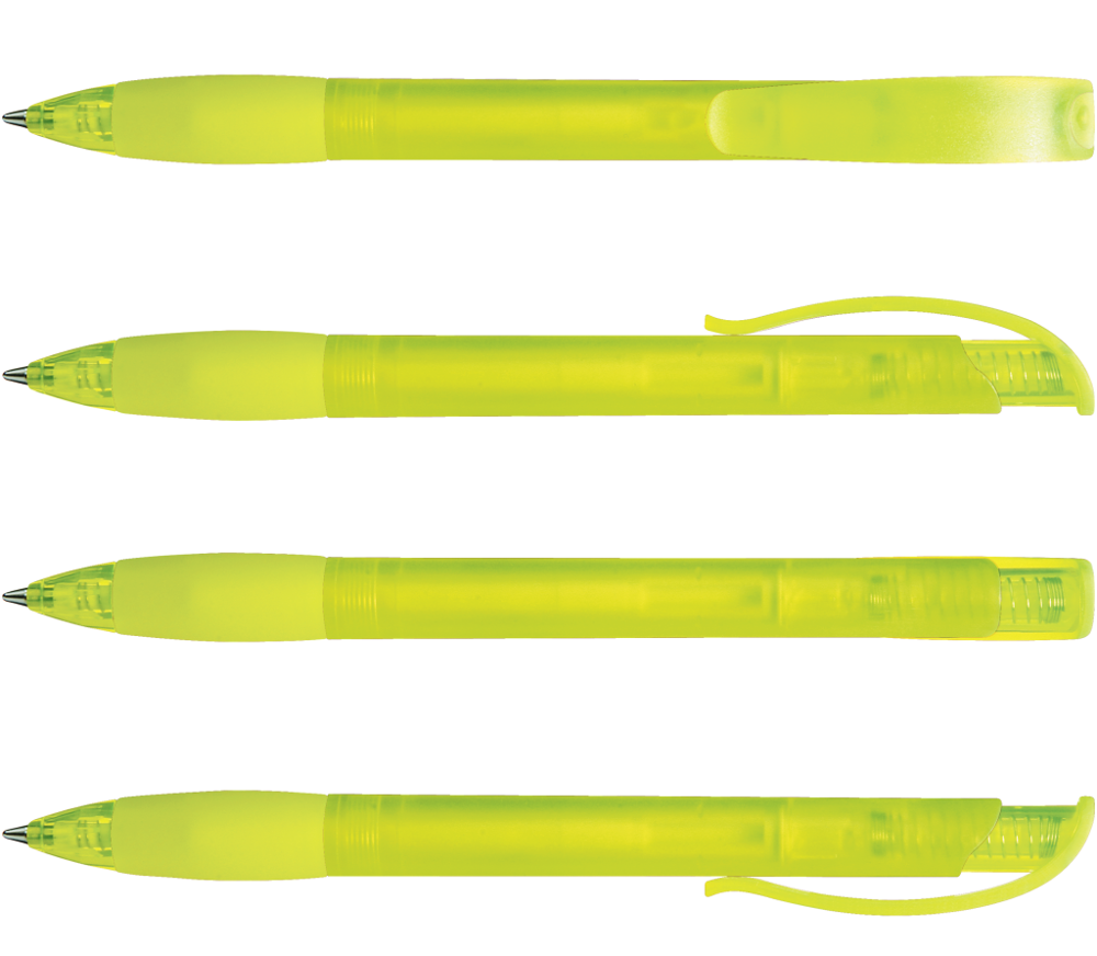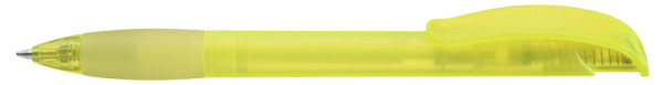 Druckkugelschreiber mit transparent gefrostetem Gehäuse, Gummigriffzone und Clipdrücker mit Stopfen.